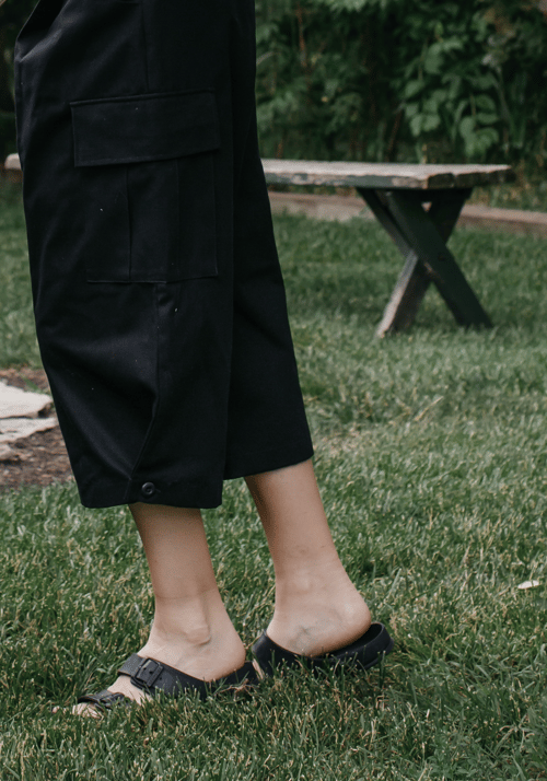 A limited-edition structured pleated 3/4 pant in 100% cotton black canvas with adjustable button-pegged cuff. Two large buttoned utility side-pockets: one is black, the other made of a vintage US Mint money bag, so each is one-of-a-kind. Front pockets plus a detachable clip-on change pocket give you....so many pockets!