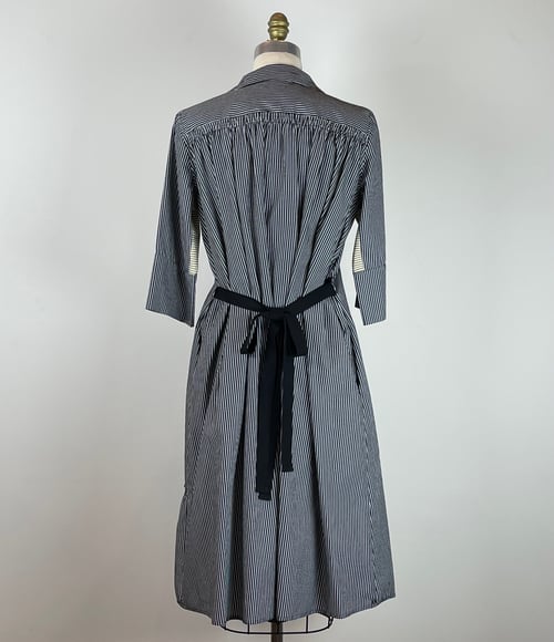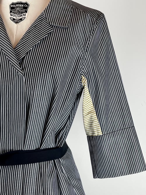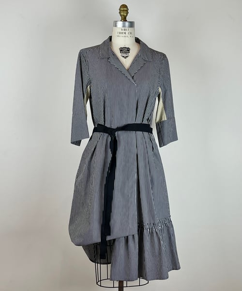 May we present: the dress for those who want it all, and then want more. Snap up the hem, or leave it down. Tie it in the back. Tie it in the front. Tie it all the way around. Wear it open like a jacket. Roll up the sleeves. It's the Swiss army knife of dresses, now in a crisp black & white striped cotton shirting with contrasting underarm panels.